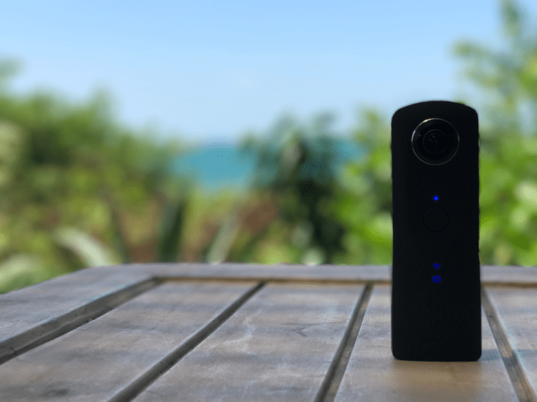 Câmera 360°: A Ricoh Theta possui um design simples, mas muito bonito e ergonômico, o que torna a câmera muito portátil e fácil de manusear.
